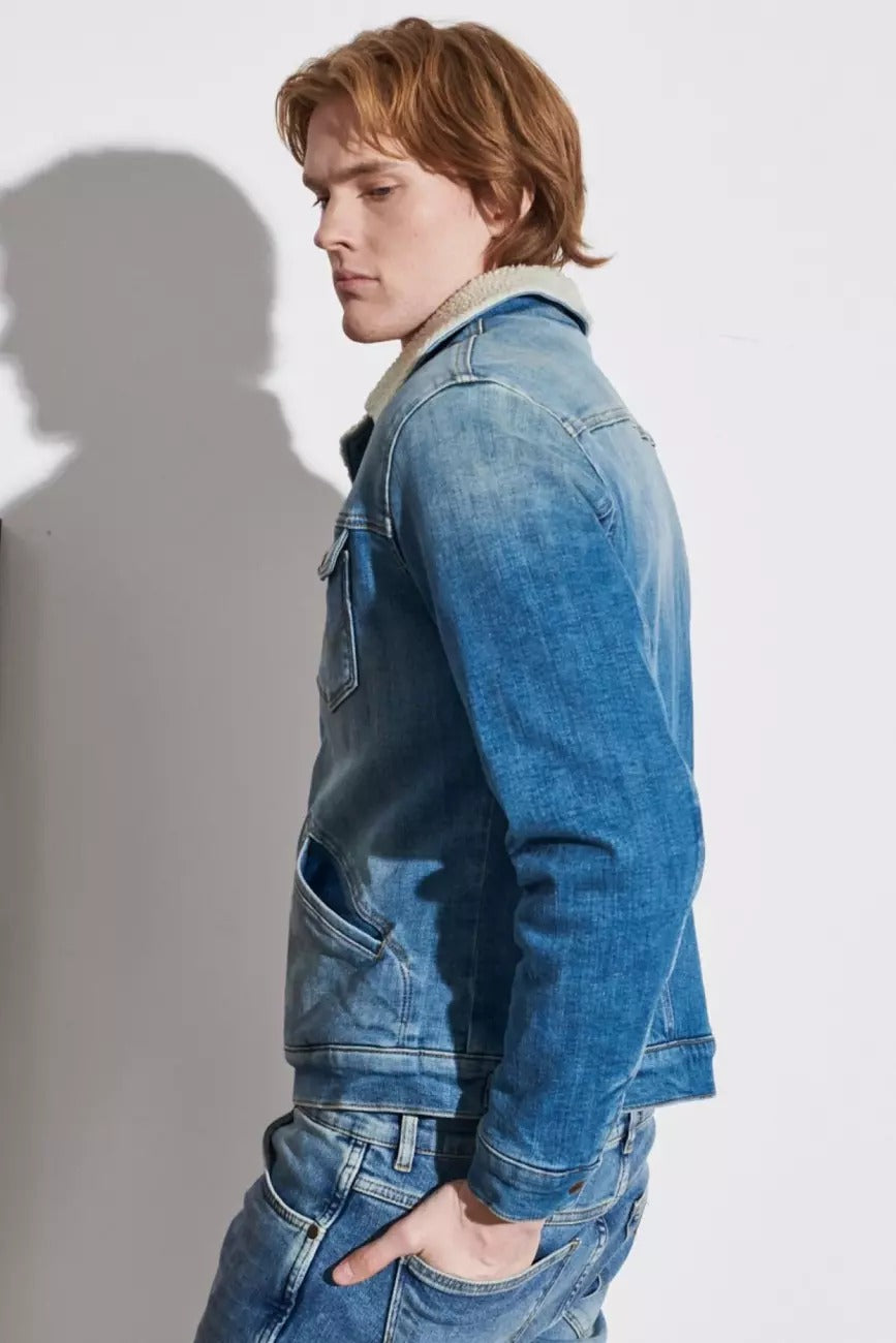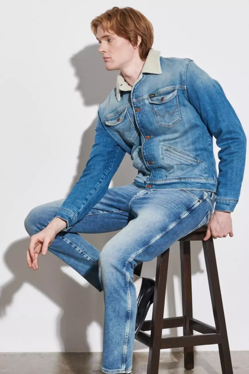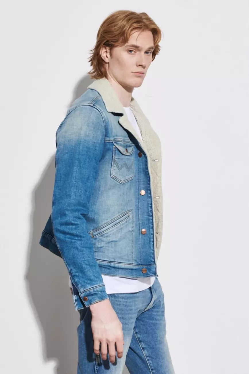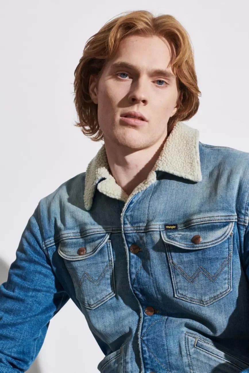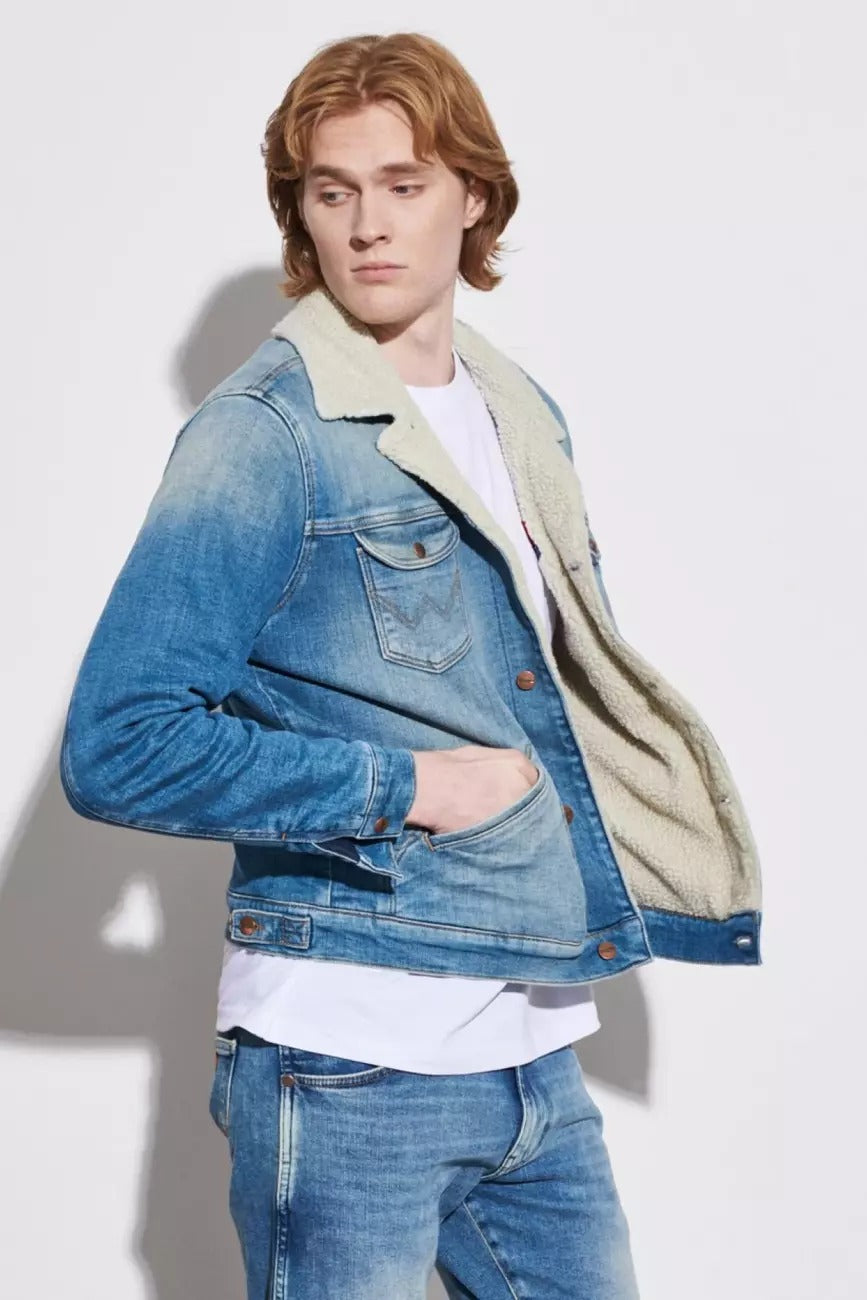 Jeansowa kurtka męska Wrangler 124MJ SHERPA Green Grass to ponadczasowy fason z nutą retro, który wraca w nowoczesnej odsłonie. Klasyczny krój regular fit i długość do pasa tworzą zbalansowaną sylwetkę, idealną zarówno na miejskie spacery, jak i weekendowe wypady. Denimowy materiał w kolorze niebieskim z efektem sprania (Green Grass) podkreśla charakterystyczny styl vintage.